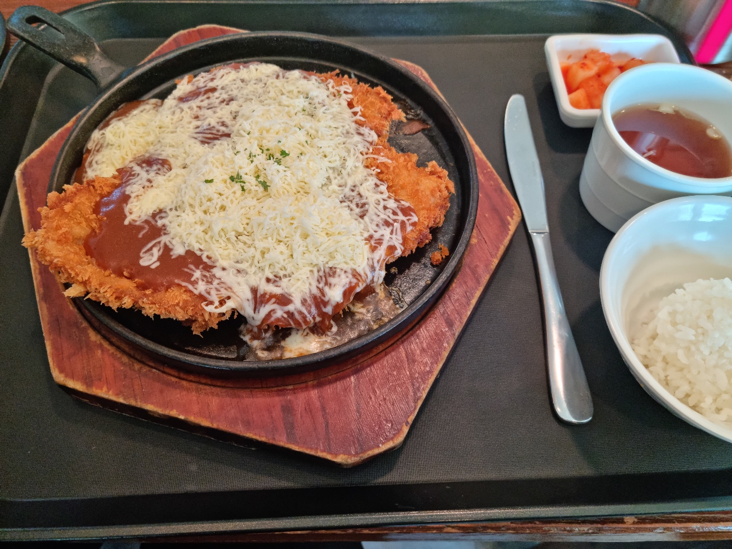 돈까스도 두껍고 맛있다. 돈까스 위에 뿌린 치즈가 시간 조금 지나면 녹아서 쭊쭊 늘어나더라